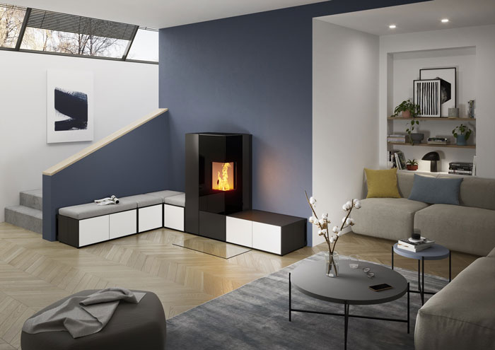 Le CONNECT PELLET EDGE avec vitre en angle témoigne de la richesse du système CONNECT et constitue une singularité absolue parmi les poêles à pellets modulaires. La vue en angle - à gauche ou à droite au choix - ouvre non seulement une vue exceptionnellement généreuse sur le feu, mais aussi de toutes nouvelles dimensions pour l'aménagement intérieur. Que ce soit contre un mur, pour créer une séparation dans une pièce ou simplement pour occuper un coin, il suffit d'un peu de créativité pour personnaliser le CONNECT PELLET EDGE avec vitre en angle, avec ses différents modules et accessoires, en alliant tous les bénéfices uniques d'un poêle RIKA : contemplation de la beauté de la flamme, silence reposant, chaleur bienfaisante, confort d'utilisation et praticité.